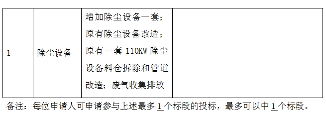 2、 工程(項(xiàng)目)規(guī)模:新增除塵設(shè)備一套;原有一套110KW除塵設(shè)備改造;廢氣收集排放,詳見(jiàn)招標(biāo)內(nèi)容;