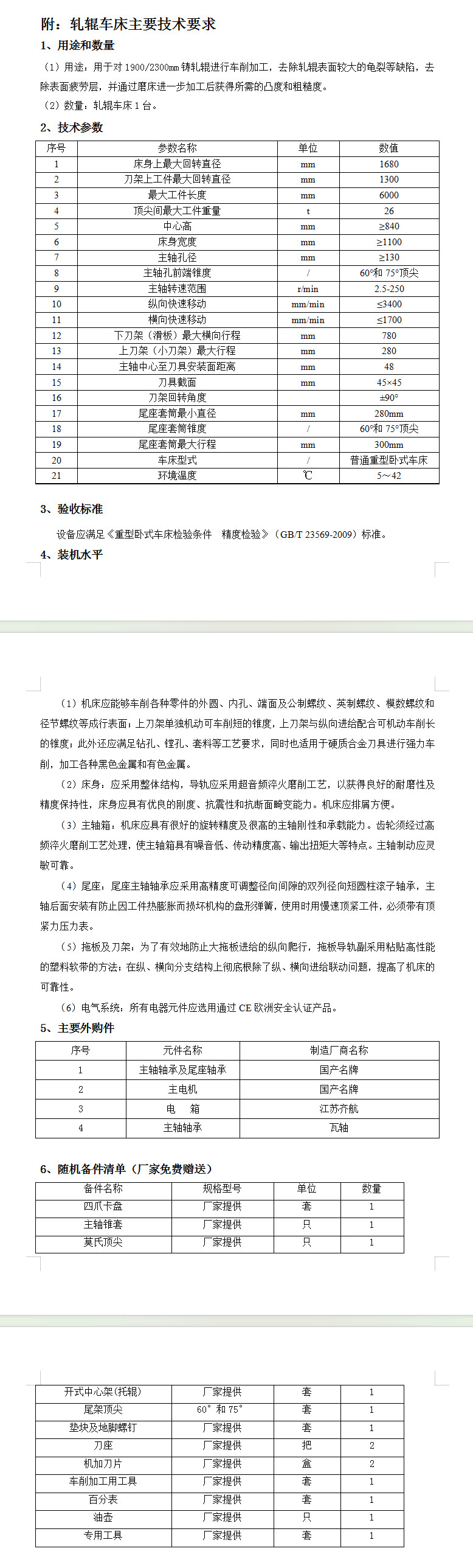 2、工程(項目)規模:合同范圍包括軋輥車床裝置1臺,供貨范圍為車床全套設備、各工藝系統、附屬設施及輔材,以及滿足設備正常生產運行所包含的其他全部內容,包含但不限于:設計、制造、包裝、裝卸、運輸、保險、安裝調試、備品備件、技術指導、員工培訓、質量保修等內容。(技術標準和要求詳見招標文件)。乙方在合同簽訂后15日內,需向甲方及設計院提供標的物基礎圖及相關資料。