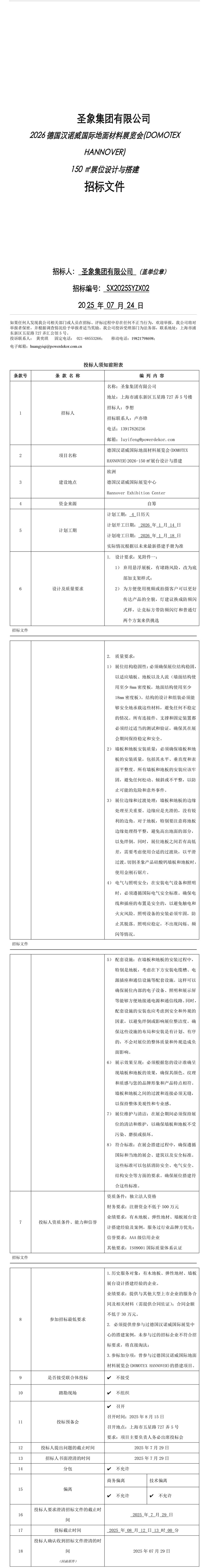 圣象集團有限公司2026德國漢諾威國際地面材料展覽會(DOMOTEX HANNOVER)150㎡展位設計與搭建招標文件