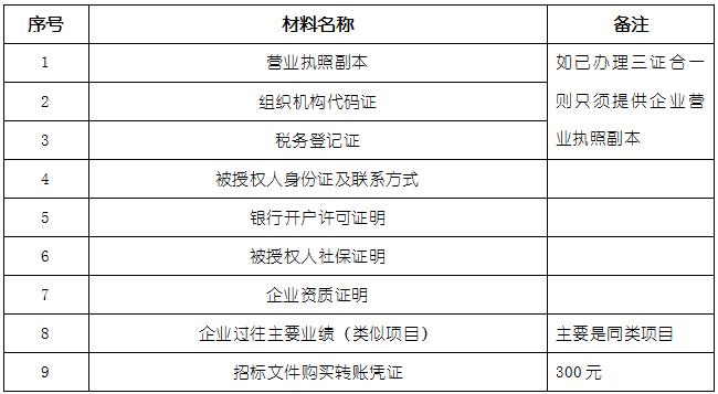 2、 凡有意向參加投標者,請在上述期間內按下表提供報名資料,相關證明文件的原件如無法提供原件則提供復印件加蓋公司公章,投標人須將上述資料的掃描件發郵件至招標聯系人處進行報名。
