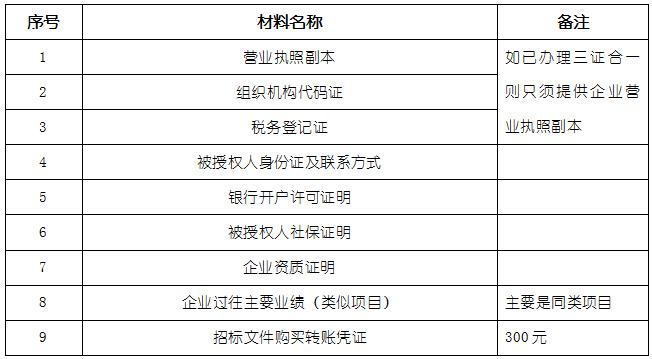 2、 凡有意向參加投標者,請在上述期間內(nèi)按下表提供報名資料,相關證明文件的原件如無法提供原件則提供復印件加蓋公司公章,投標人須將上述資料的掃描件發(fā)郵件至招標聯(lián)系人處進行報名。