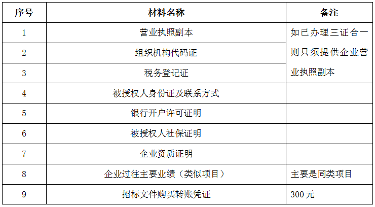 2、 凡有意向參加投標者,請在上述期間內按下表提供報名資料,相關證明文件的原件如無法提供原件則提供復印件加蓋公司公章,投標人須將上述資料的掃描件發郵件至招標聯系人處進行報名。