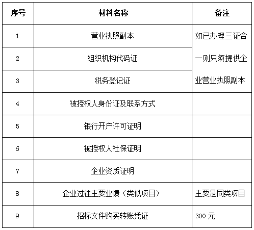 2、 凡有意向參加投標(biāo)者,請?jiān)谏鲜銎陂g內(nèi)按下表提供報(bào)名資料,相關(guān)證明文件的原件如無法提供原件則提供復(fù)印件加蓋公司公章,投標(biāo)人須將上述資料的掃描件發(fā)郵件至招標(biāo)聯(lián)系人處進(jìn)行報(bào)名。