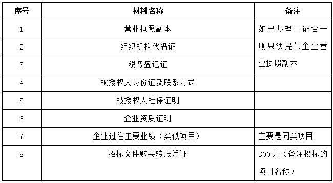 2、 凡有意向參加投標(biāo)者,請(qǐng)?jiān)谏鲜銎陂g內(nèi)按下表提供報(bào)名資料,相關(guān)證明文件的原件如無法提供原件則提供復(fù)印件加蓋公司公章,投標(biāo)人須將上述資料的掃描件發(fā)郵件至招標(biāo)聯(lián)系人處進(jìn)行報(bào)名。