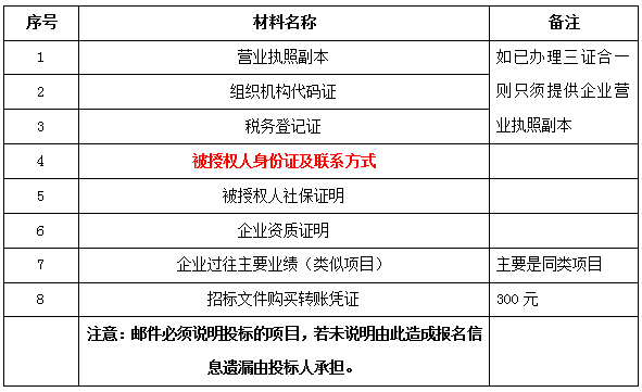 2、 凡有意向參加投標者,請在上述期間內(nèi)按下表提供報名資料,相關(guān)證明文件的原件如無法提供原件則提供復印件加蓋公司公章,投標人須將上述資料的掃描件發(fā)郵件至招標聯(lián)系人處進行報名。