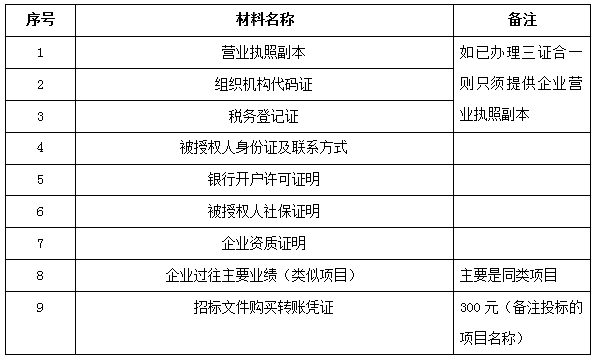 2、 凡有意向參加投標者,請在上述期間內按下表提供報名資料,相關證明文件的原件如無法提供原件則提供復印件加蓋公司公章,投標人須將上述資料的掃描件發郵件至招標聯系人處進行報名。