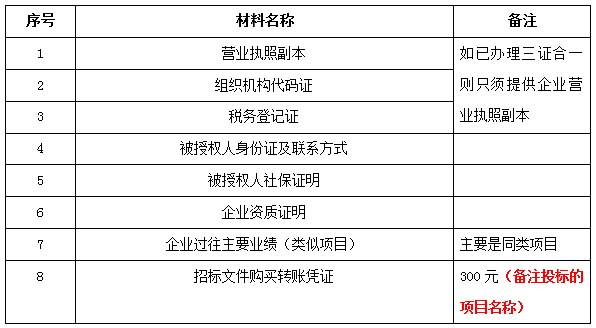 2、 凡有意向參加投標(biāo)者,請(qǐng)?jiān)谏鲜銎陂g內(nèi)按下表提供報(bào)名資料,相關(guān)證明文件的原件如無法提供原件則提供復(fù)印件加蓋公司公章,投標(biāo)人須將上述資料的掃描件發(fā)郵件至招標(biāo)聯(lián)系人處進(jìn)行報(bào)名。