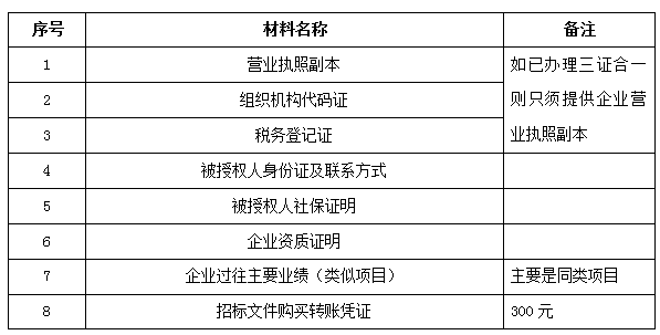 2、 凡有意向參加投標(biāo)者,請(qǐng)?jiān)谏鲜銎陂g內(nèi)按下表提供報(bào)名資料,相關(guān)證明文件的原件如無(wú)法提供原件則提供復(fù)印件加蓋公司公章,投標(biāo)人須將上述資料的掃描件發(fā)郵件至招標(biāo)聯(lián)系人處進(jìn)行報(bào)名。