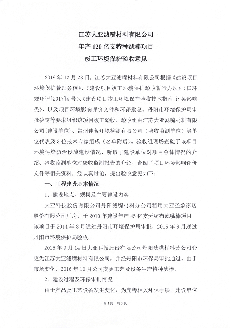 根據《國務院關于修改<建設項目竣工環境保護管理條例>》(國務院令第682號)以及環保部《關于發布<建設項目竣工環境保護驗收暫行辦法>的公告》(國環規環評(2017)4號),現將江蘇大亞濾嘴材料有限公司年產120億支特種濾棒項目環境保護驗收內容(包括驗收監測報告、驗收意見)公示如下: