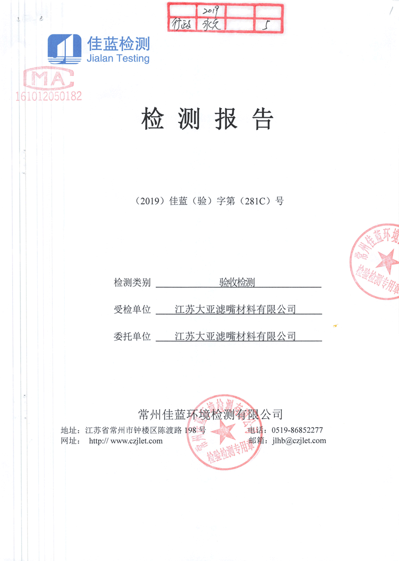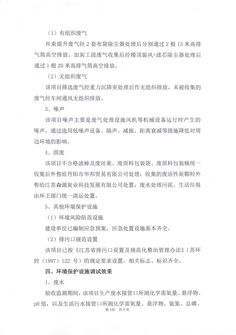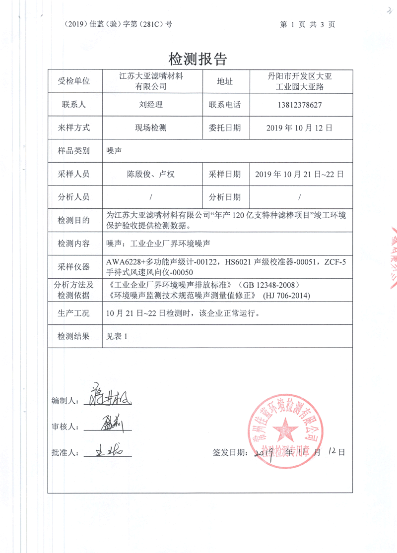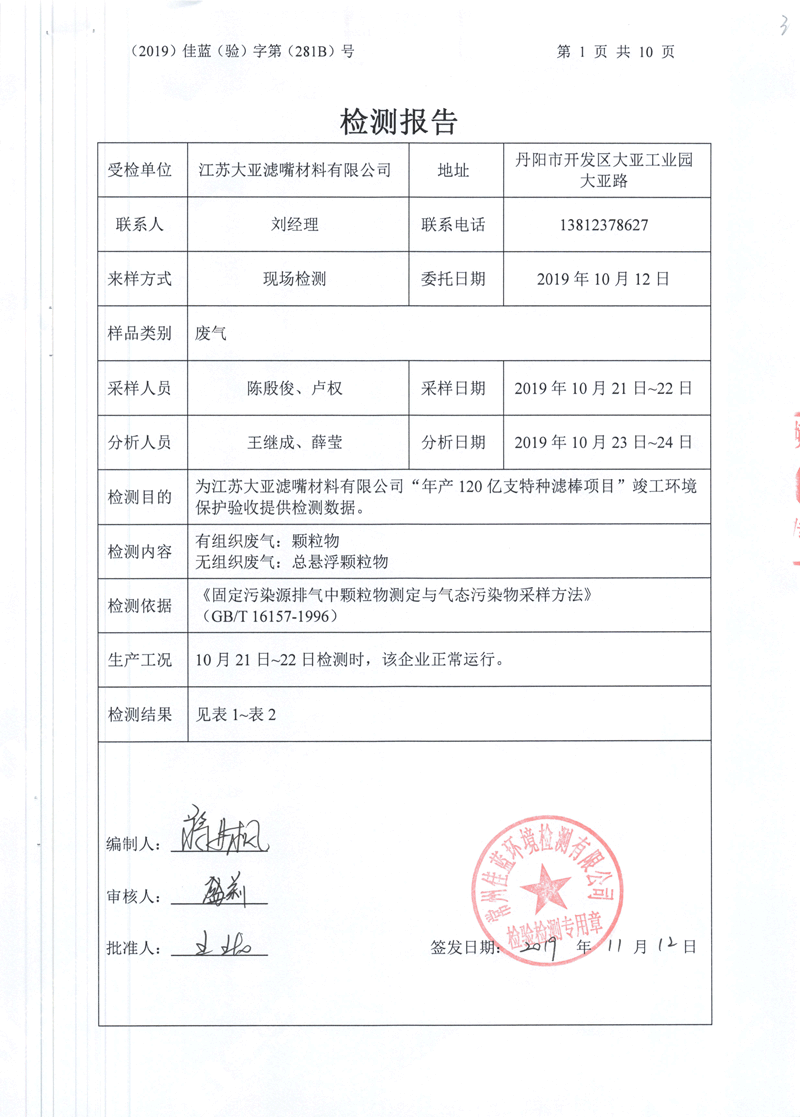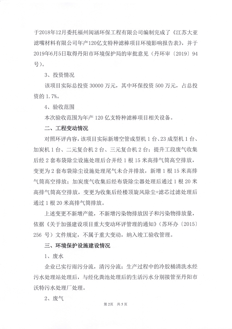 江蘇大亞濾嘴材料有限公司年產120億支特種濾棒項目環境保護驗收監測情況自主公示