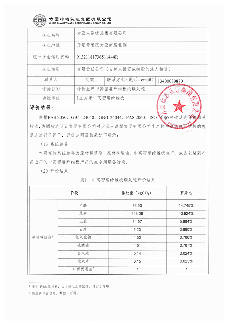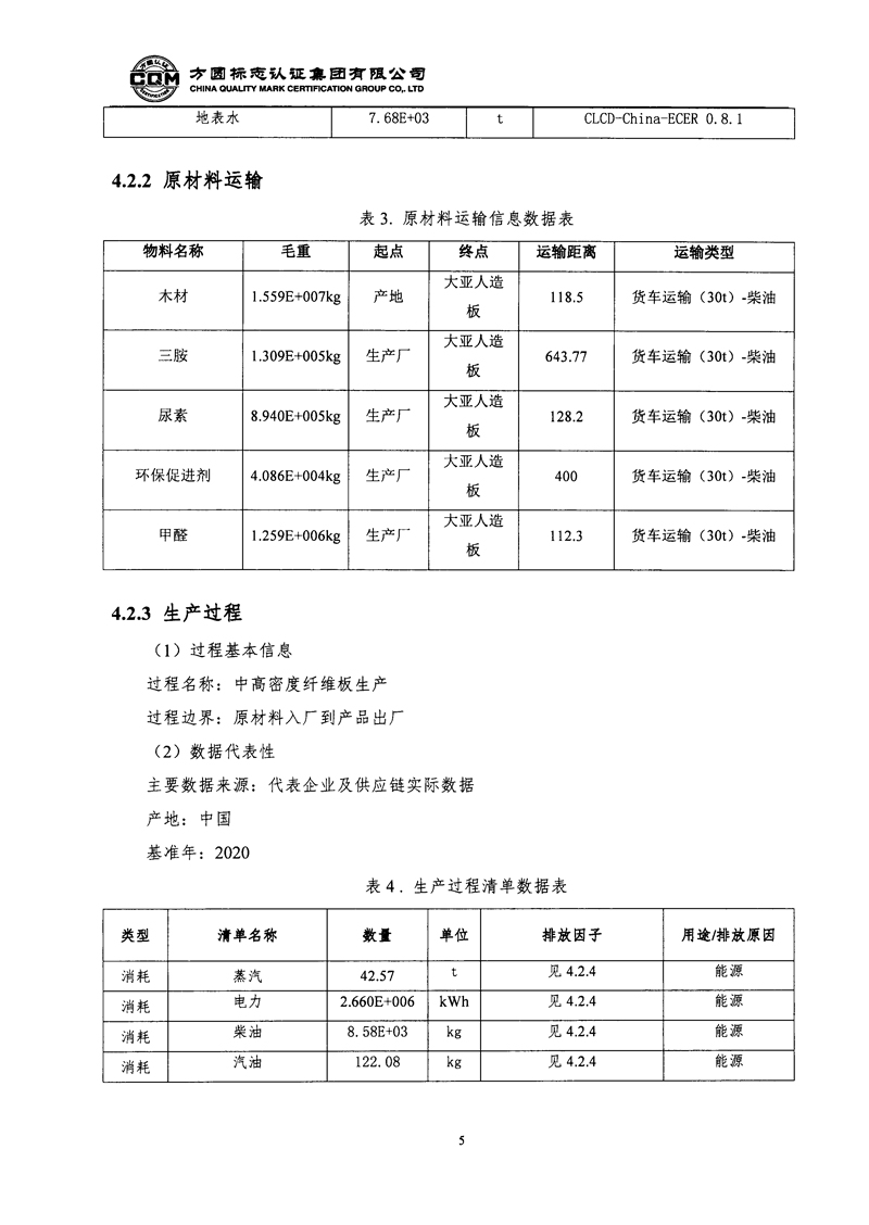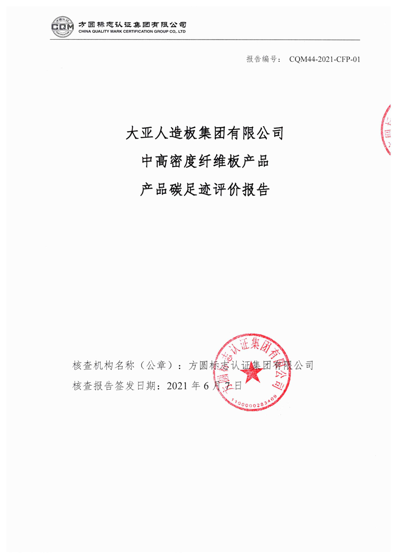 大亞人造板集團有限公司中高密度纖維板產(chǎn)品產(chǎn)品碳足跡評價報告自主公示